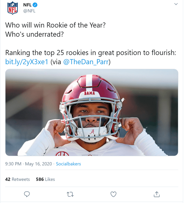This Tweet came directly from the NFL official Twitter page. Personally, it got me thinking. With everything that happened in the NFL draft this year, who is going to be the Rookie of the Year? I feel that the rookie of the year depends on the team the rookies play on, as well as their individual performance. For instance, if Joe Burrow has a great season, but the Cincinnati Bengals have a terrible record, they get the number one pick and he has no shot at winning. I feel that the front runner right now is Tua Tagovailoa of the Miami Dolphins, because he has a somewhat decent team with the addition of Matt Breida. I also feel this way because I am not confident in all of the pieces surrounding Joe Burrow. I will say that drafting Tee Higgans and resigning AJ Green is a big deal. However, their offensive line and defense are too all over the place for me to be confident. If we are going by just the roster around them, then Justin Herbert wins hands down. The Los Angeles Chargers rosters is loaded with talent. Their defense is great when healthy. Keenan Allen and Mike Willams are a great wide receiver duo. My fear with Justin Herbert is that he may have to sit behind Tyrod Taylor. I feel their offensive line is really rough. One thing all of these teams have in common is, they all have bad offensive lines. The Miami Dolphins addressed this issue in free agency as well as the NFL draft. Therefore, I feel Tua Tagovailoa has the best chance to win Rookie of the Year based on talent as well as the talent around him. This will be enhanced with the overall improvement that the team will grow into in the upcoming year.